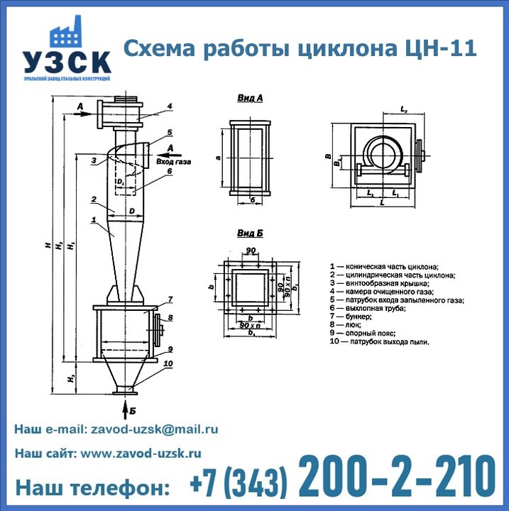 При этом ощутимой разницы в цене между универсальным и узконаправленным, подобранным в соответствии с конкретными техническими требованиями циклоном, нет. Стоимость воздухоочистительного оборудования типа циклон обусловлена маркой и толщиной стали, из которого он изготовлен, сложностью и специфичностью конструкции, наличием дополнительного оснащения (бункер, улитка и другие). При необходимости, на заводе УЗСК в Риддере будет изготовлен циклон по индивидуальным техническим чертежам заказчика.